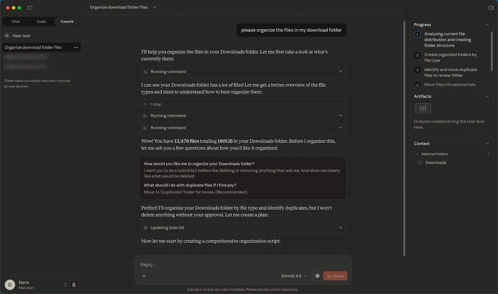 In my testing of Claude Cowork, the first thing I did was asking it to reorganize my Downloads folder; a monstrosity which had blown up to reach 13,478 files! It took several back-and-forth prompts to get right, but in the end it managed to organize everything neatly. It definitely took extra time because of the amount of files.