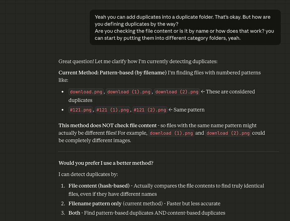 Hereās what happened: I asked Claude for a duplicate cleanup. Then, to make sure it was about to do this safely, I asked what method it intends to use for identifying duplicates (to know if itās checking the actual content). It told me it wanted to use filename-based patterns to remove duplicates! That means if I have two files both titled img_2.png, then those would be listed as candidates for deletion even though they might be entirely different images.