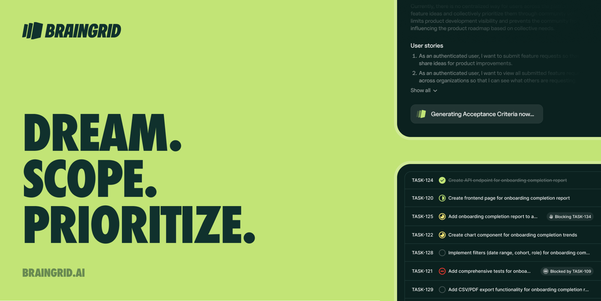 BrainGrid is the Product Management Agent for AI coding. It turns vague ideas into clear specs and maps your UX flows. It asks the clarifying questions you forgot to ask and breaks work into structured tasks that AI tools can actually build correctly.